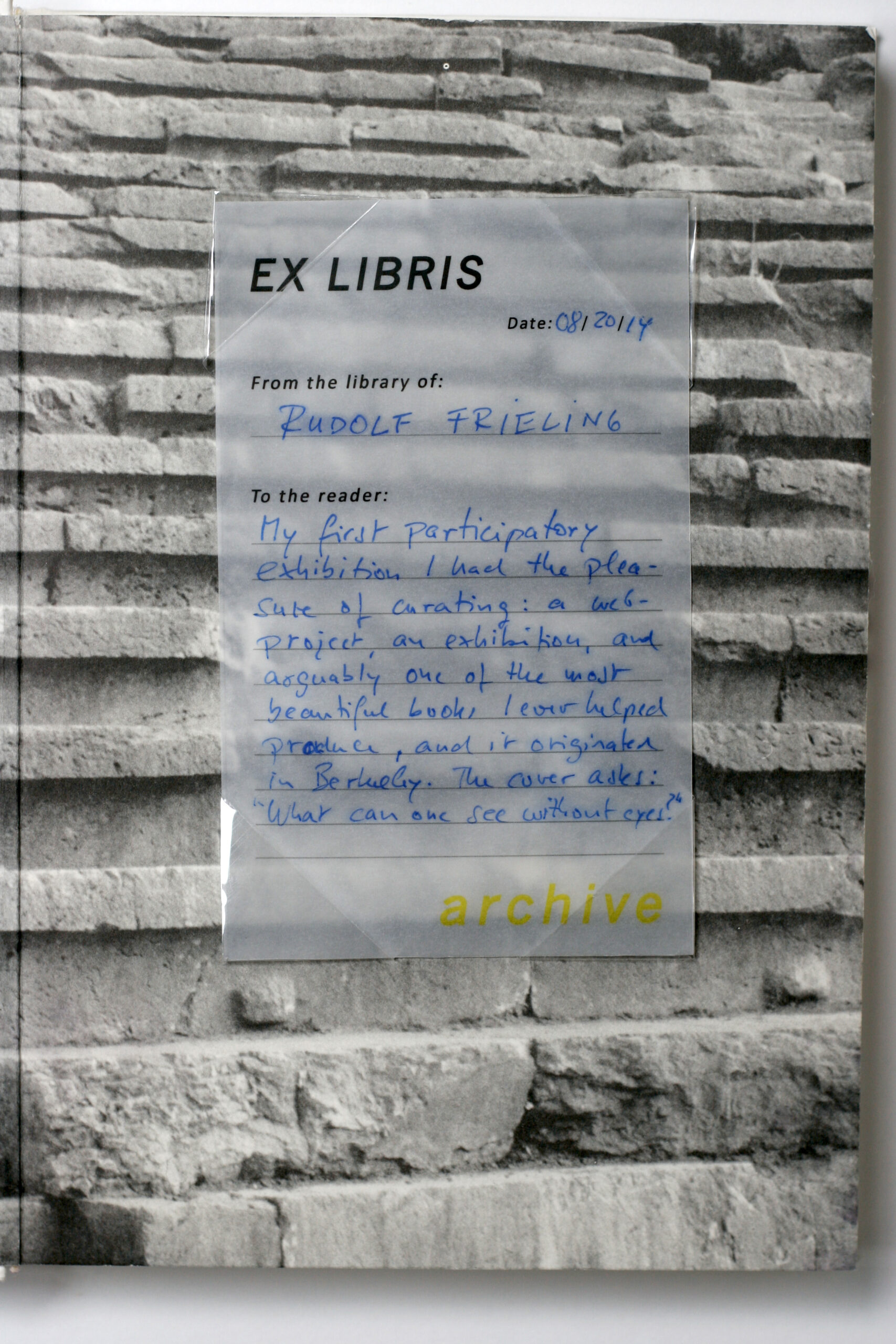 Frieling contributes his personal copy of Was Kann Man Sehen Ohne Augen? Jochen Gerz Das Berkeley Orakel. The german title translates to “What Can One See Without Eyes?” This project with artist Jochen Gerz and the Berkeley Art Museum was Frieling’s first encounter with participatory art in the 90’s and was documented with this publication.